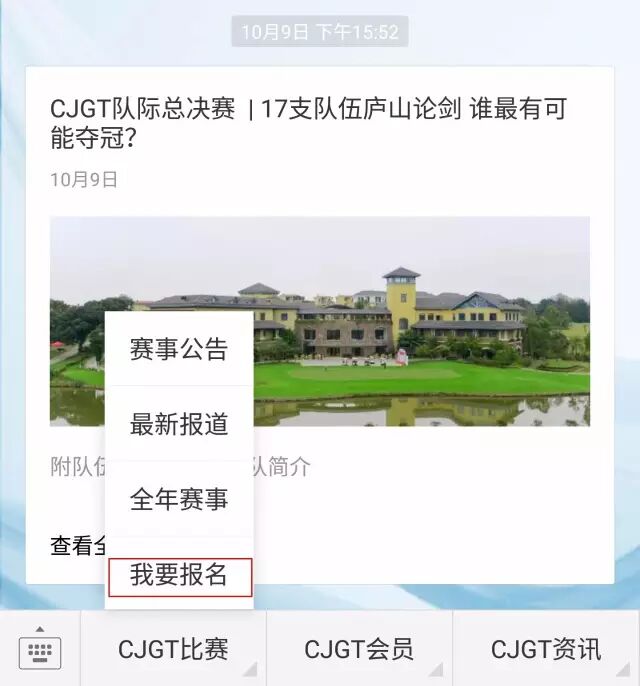 报名方式二、搜索添加微信公众号“cjgt-golf”,点击“CJGT比赛“——”我要报名“